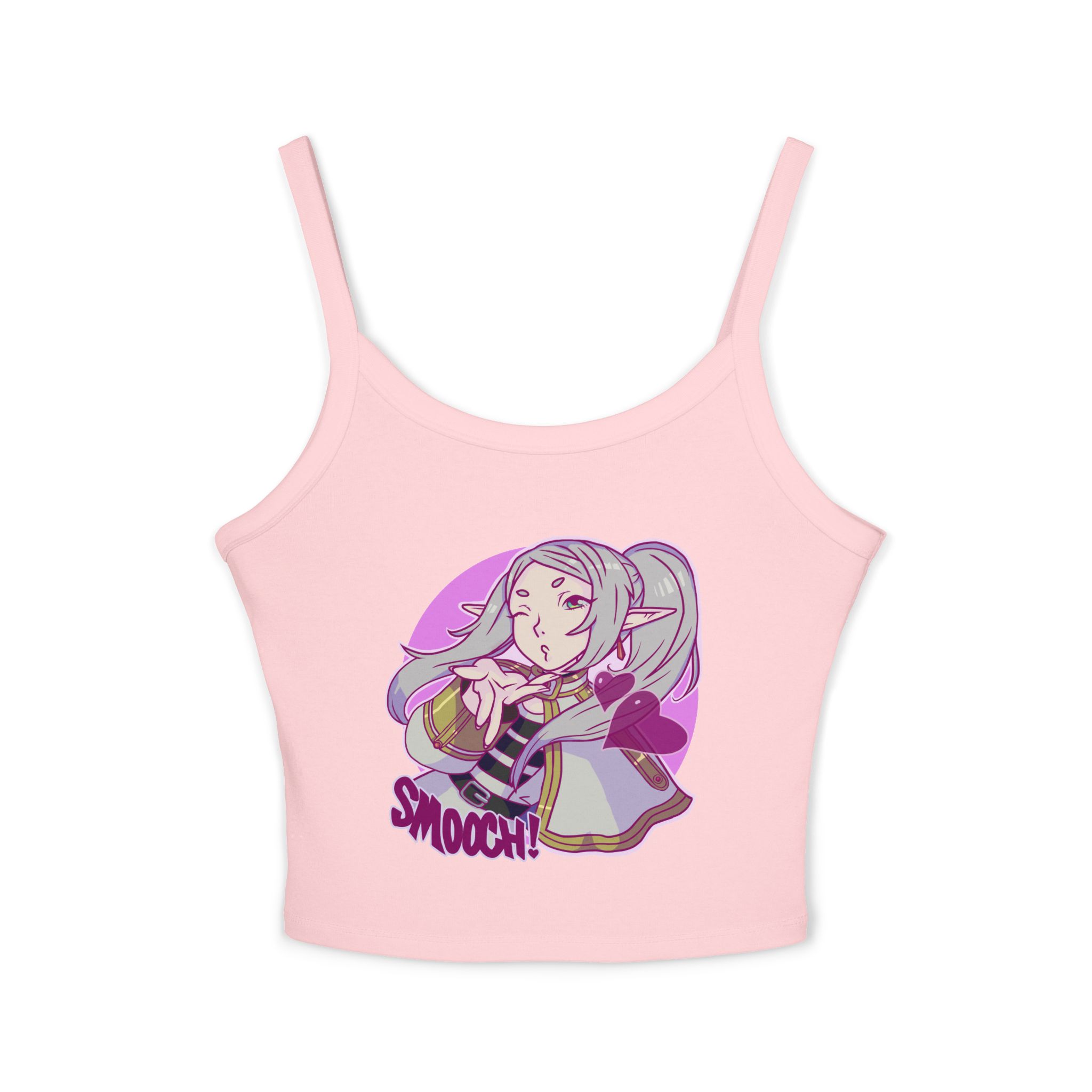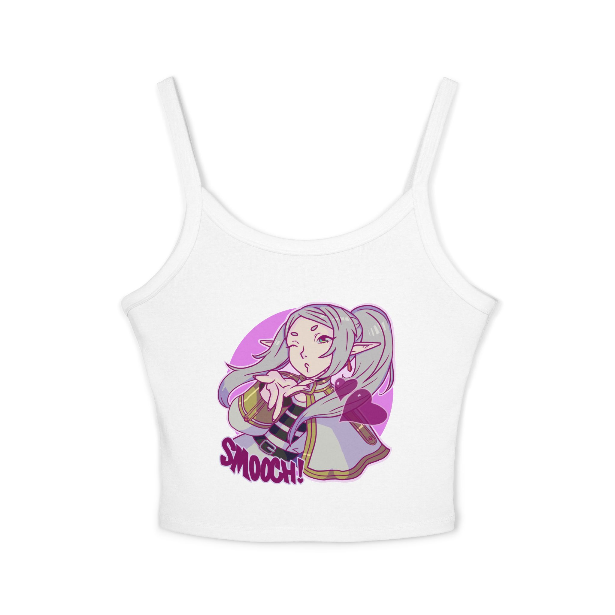 Soft, fitted spaghetti-strap crop with a Frieren-inspired loveable printed at the chest. The illustration captures a playful, flirty moment—powder-pastel purples, a cheeky “SMOOCH!” caption, and heart accents—so the top feels like a little burst of youthful energy. Wear it layered under an oversized hoodie for casual days, pair it with high-waisted jeans for a weekend hangout, or let it stand alone on warm afternoons when you want a bright, character-driven statement. The fabric drapes close to the body without feeling restrictive, while the thicker straps give comfortable support and a clean neckline that shows off the print.
