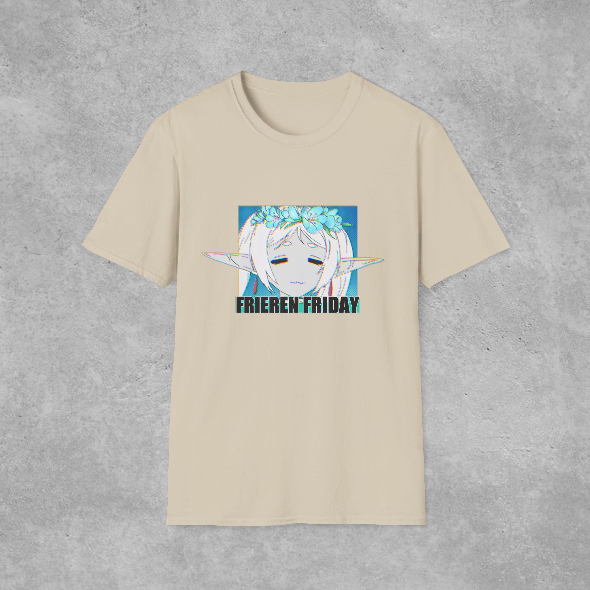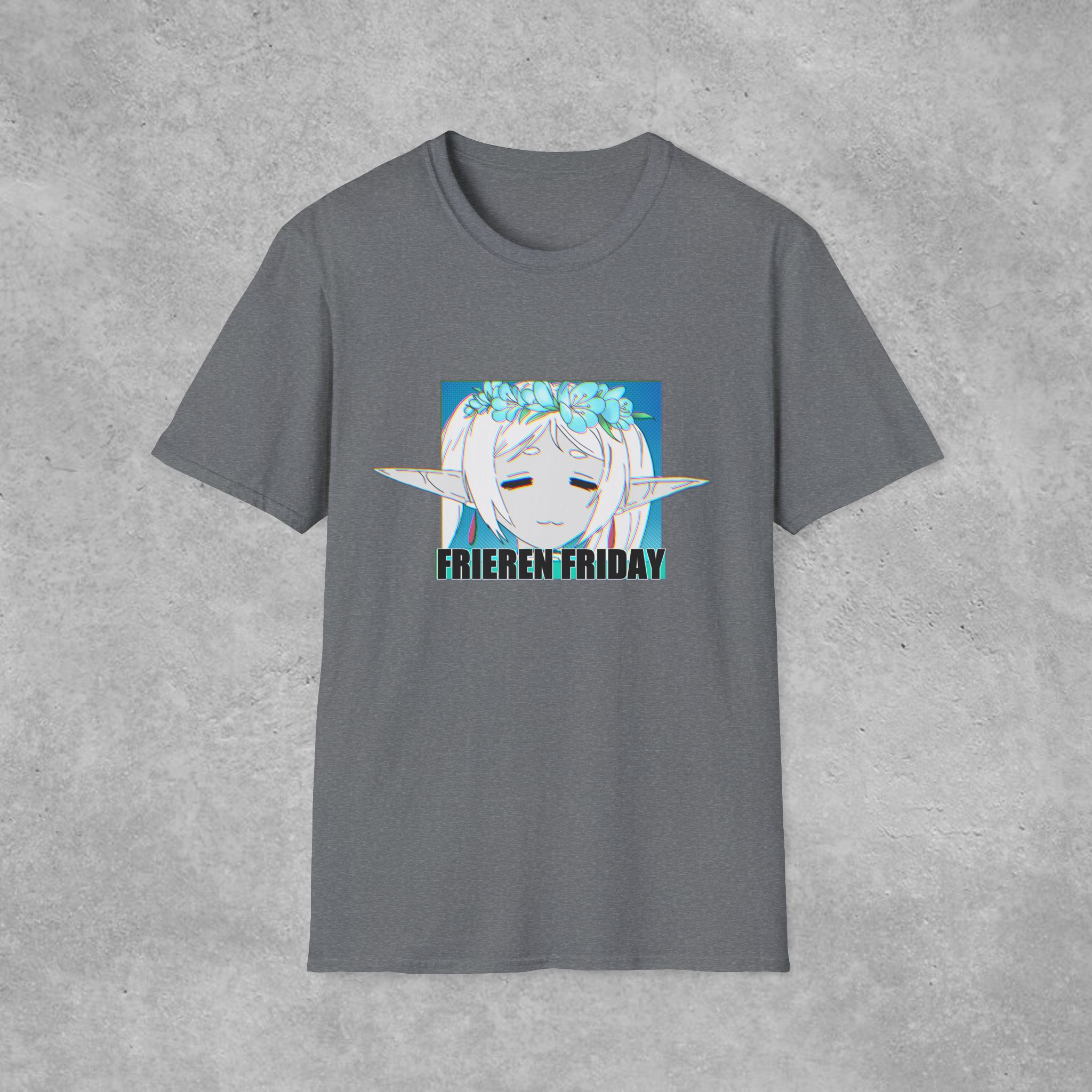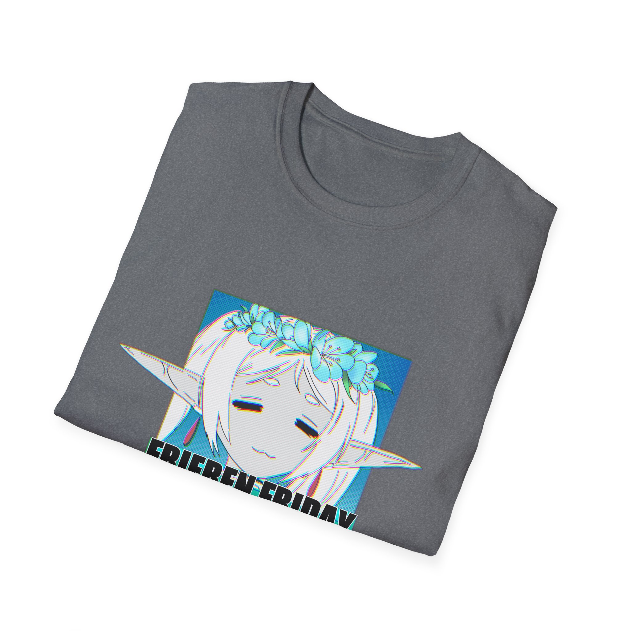 This lightweight crewneck tee brings a soft, lived-in feel to your everyday wardrobe while showcasing a playful anime-inspired design. The front print features a dreamy, floral-crowned elf with calm, half-closed eyes and the caption “FRIEREN FRIDAY,” giving the shirt a relaxed, whimsical vibe that reads like a quiet homage to slow-paced fandom hangouts. Wear it on low-key streaming nights, casual meetups with fellow fans, or when you want your outfit to say ‘I’m here for the chill vibes and good conversation.’ The fabric is smooth and breathable, holds prints beautifully, and keeps its shape through repeated wear thanks to reinforced shoulder tape and a sturdy ribbed collar. Tear-away label and ethically sourced ring-spun cotton add comfortable, mindful finishing touches.