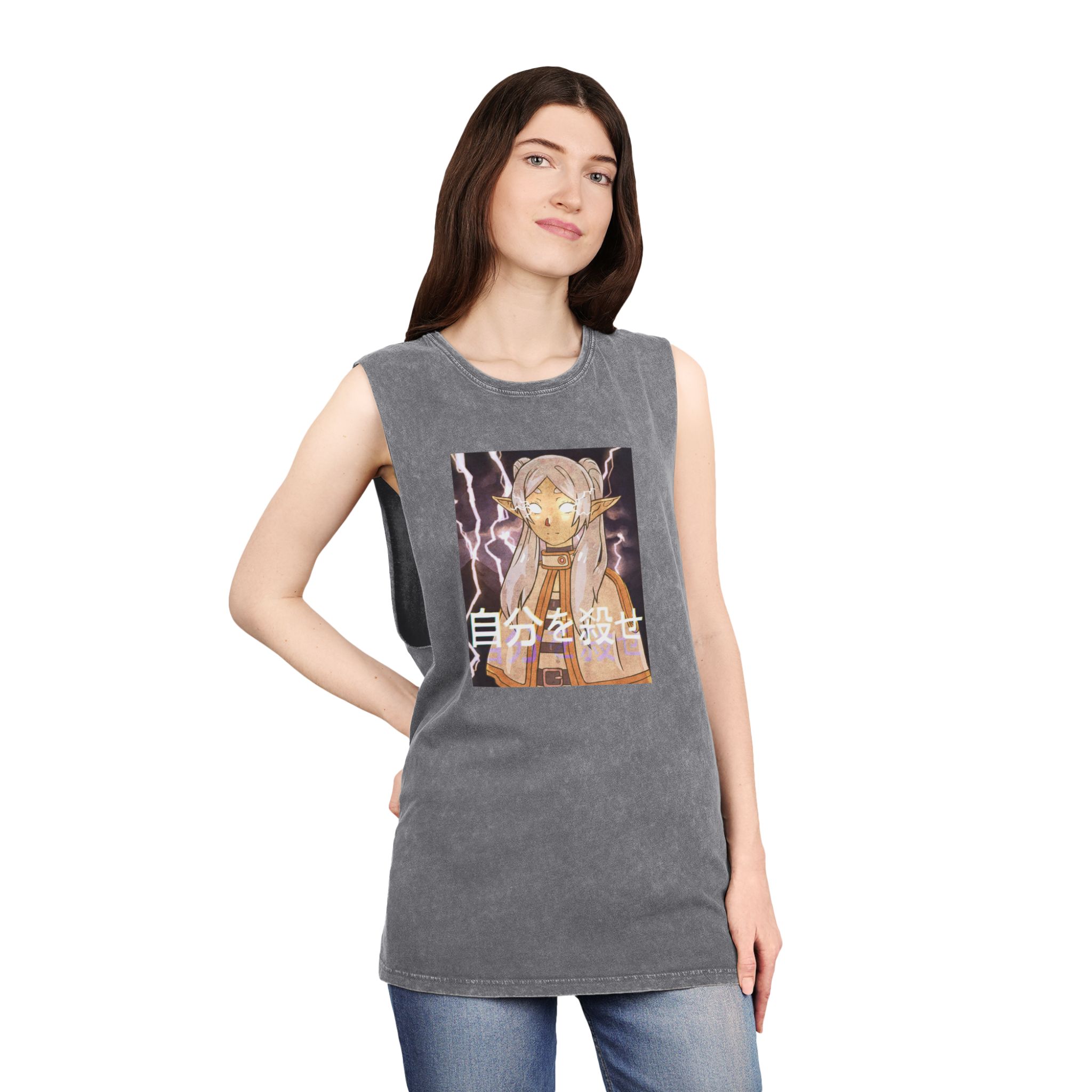 This stonewash tank brings an edgy, lived-in vibe to your summer rotation. The washed grey fabric feels soft and feather-light against skin, with raw-cut sleeves and a comfy ribbed collar that slips on easily then snaps back into place. A compact, moody anime-style print sits on the chest, framed by subtle lightning accents and bold Japanese characters for an unmistakable statement. Wear it layered under a denim jacket or alone when you want to let the graphic and texture do the talking — it sits true to size with durable double-stitched hems and reinforced shoulder tape so it keeps its shape through repeat wear.