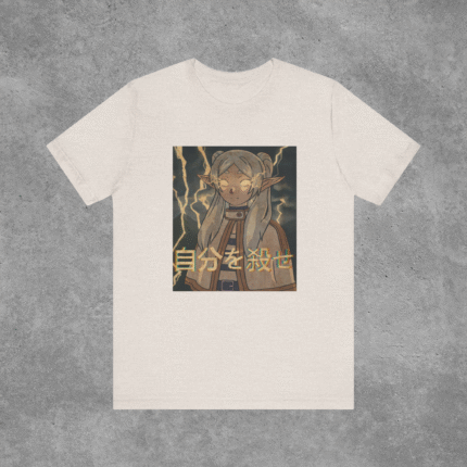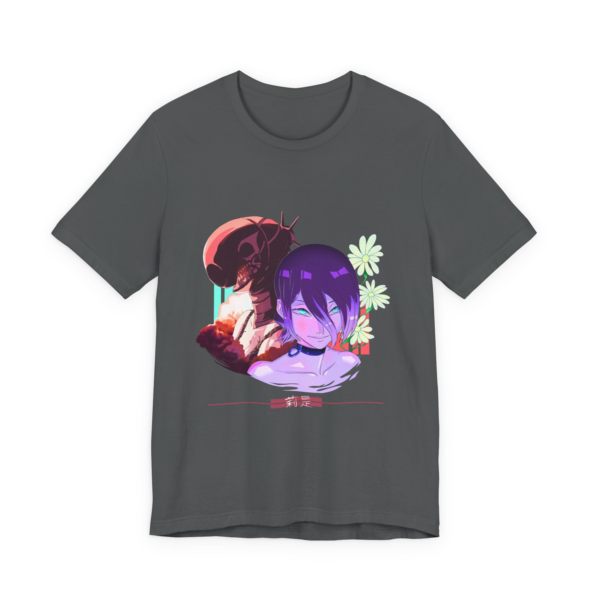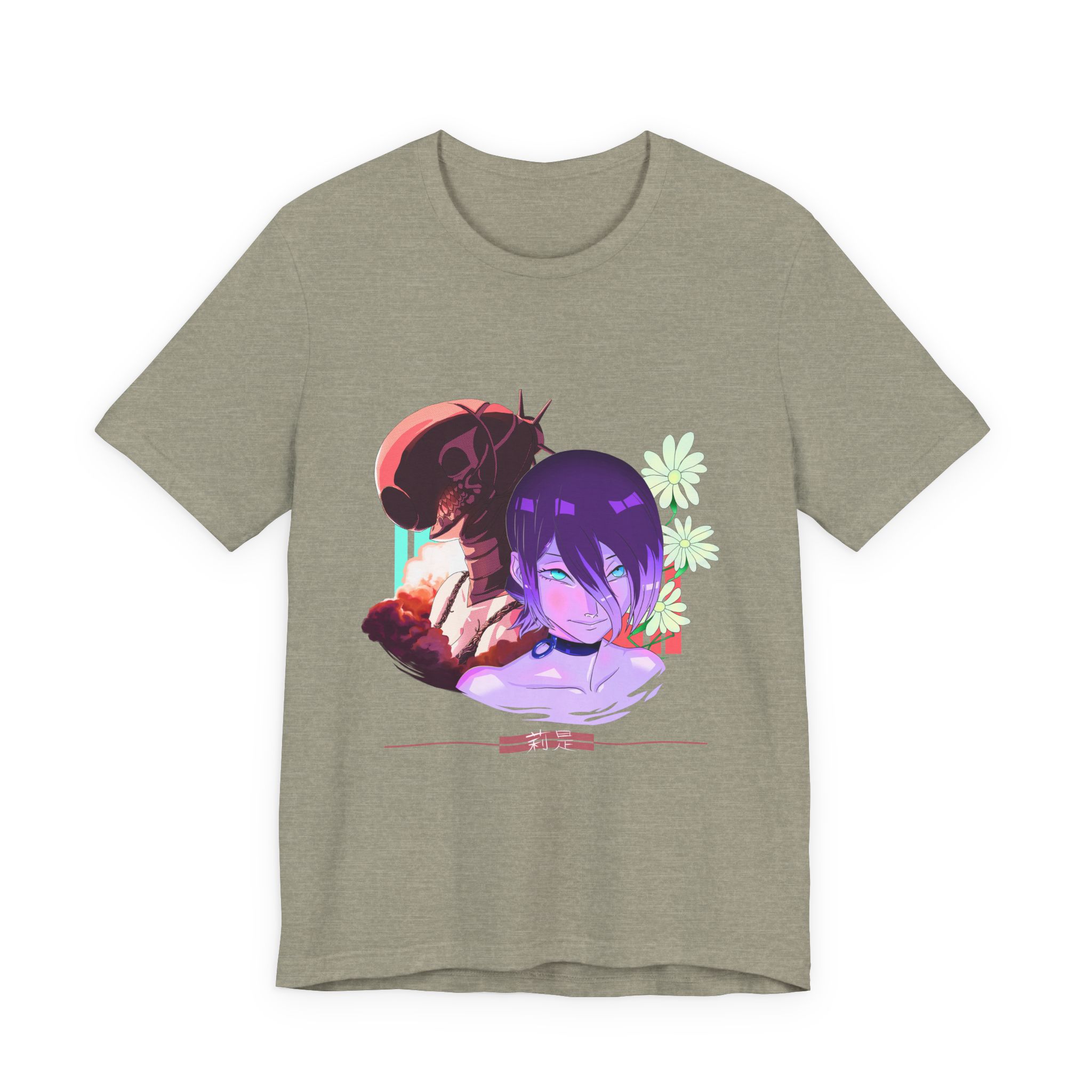 A lightweight, breathable tee that blends moody anime aesthetics with soft, modern comfort. The front print pairs a melancholic portrait of Reze from Chainsaw Man and her Bomb form in the background and her name in Kanji below. It sits close to the body without feeling tight, the crew neckline and retail fit make it easy to layer under jackets or wear solo while keeping the silhouette clean. This shirt moves with you — whether you’re heading to a late-night con, sketching in a café, or lounging at home — and the crisp sleeve and neck prints keep the design feeling fresh wash after wash. Responsibly produced fabric and a removable tear-away label mean it feels good on the skin and aligns with thoughtful production values.