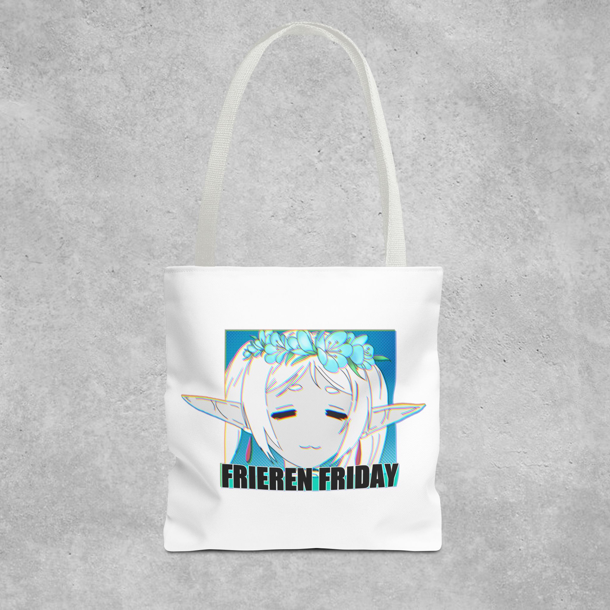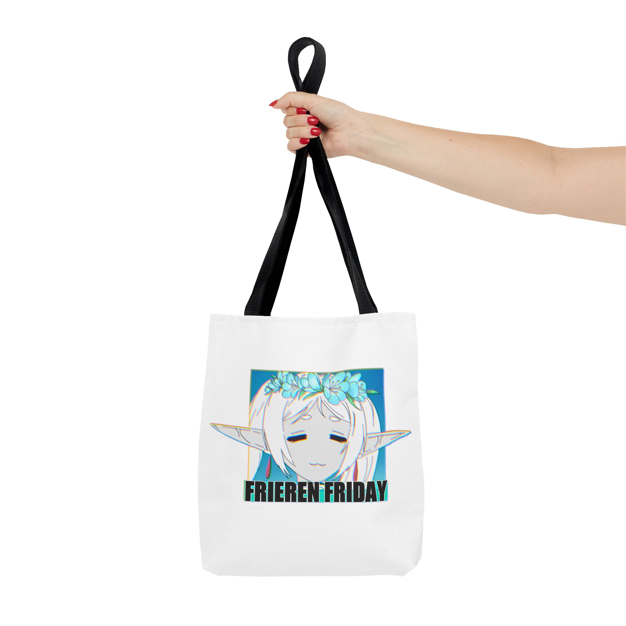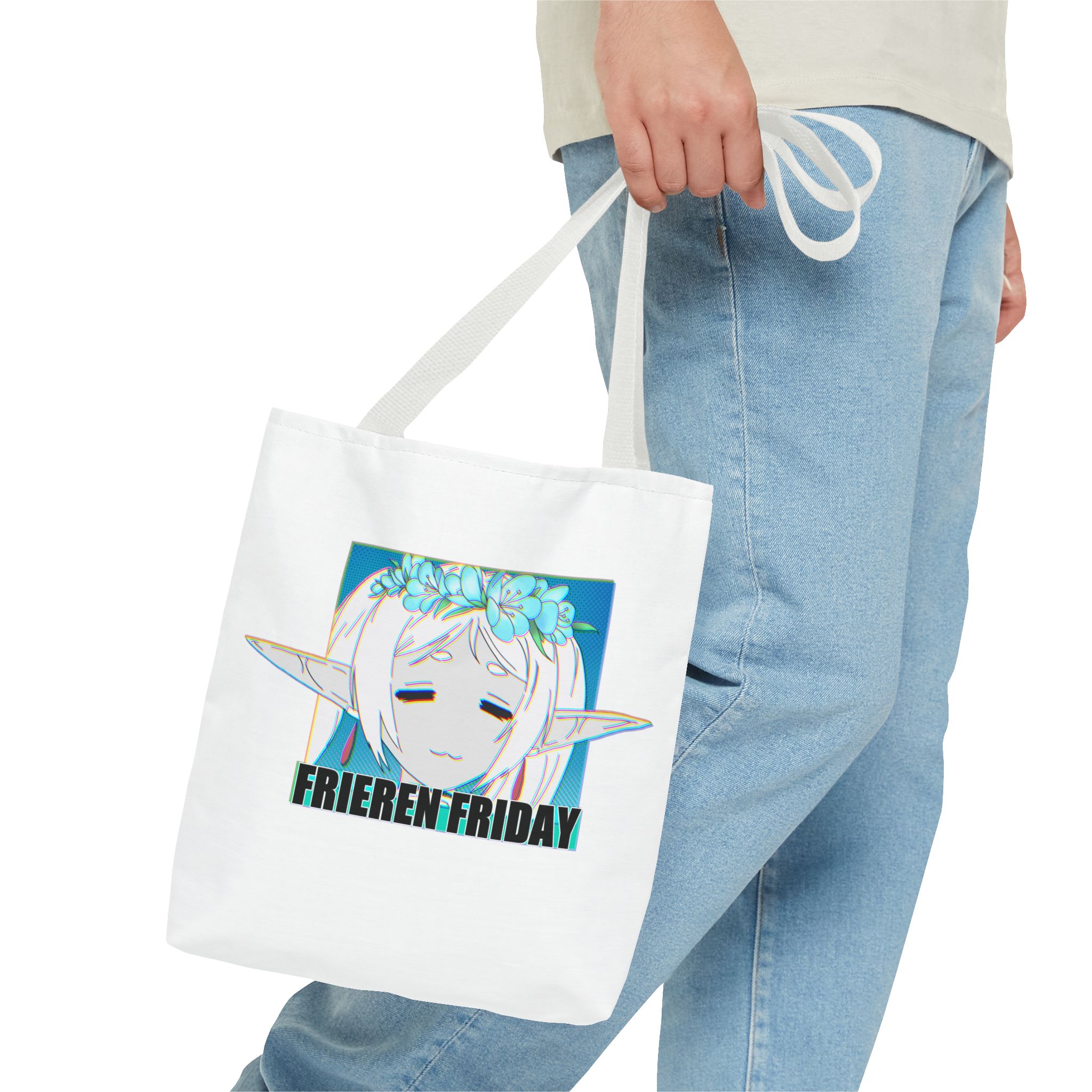 A lightweight, durable tote that carries quiet fandom with gentle style. This polyester tote features a soft white body and contrasting black handles, showcasing a serene anime-inspired portrait framed by cool teal tones and the text “FRIEREN FRIDAY.” It feels like a small, personal nod to slow moments—library runs, class notes, weekend markets—without shouting for attention. The roomy boxed corners and reinforced handle stitching hold sketchbooks, snacks, or a compact laptop with confidence. For someone who likes understated otaku flair and practical design, this tote slips into daily life easily and wears in, not out.
