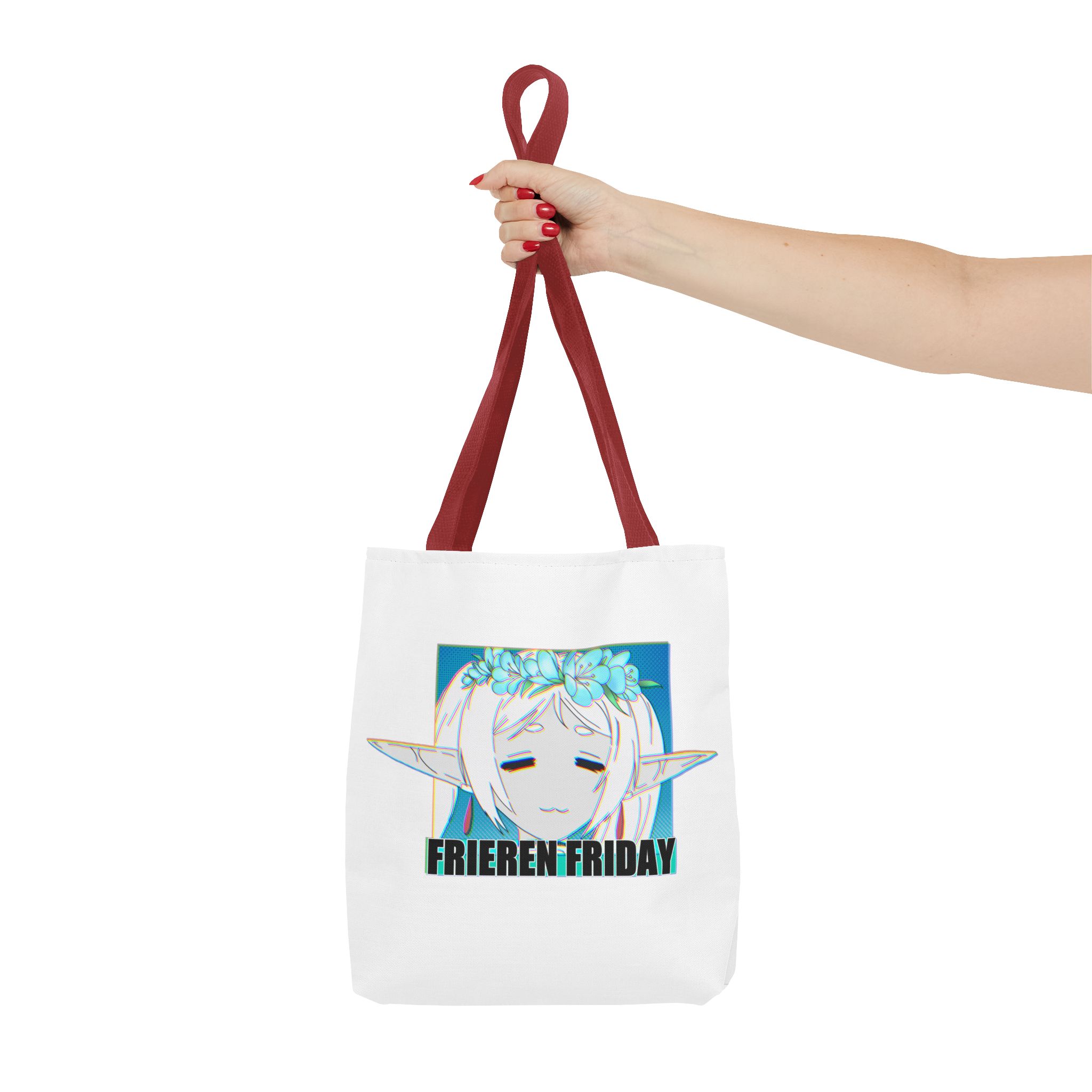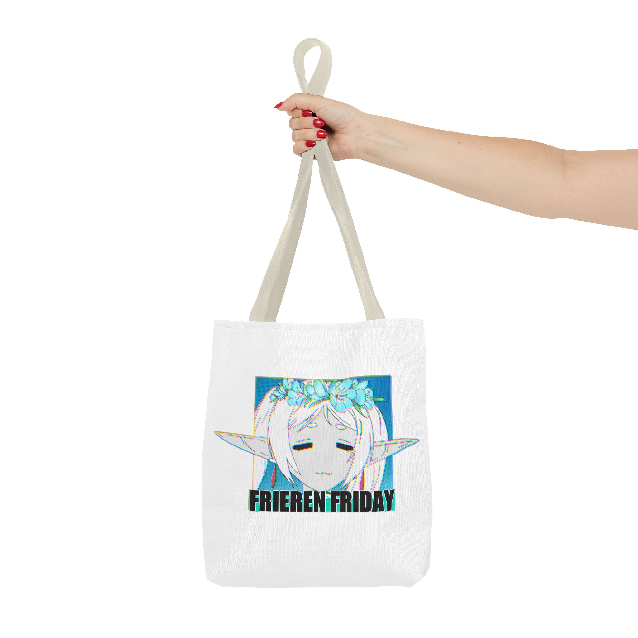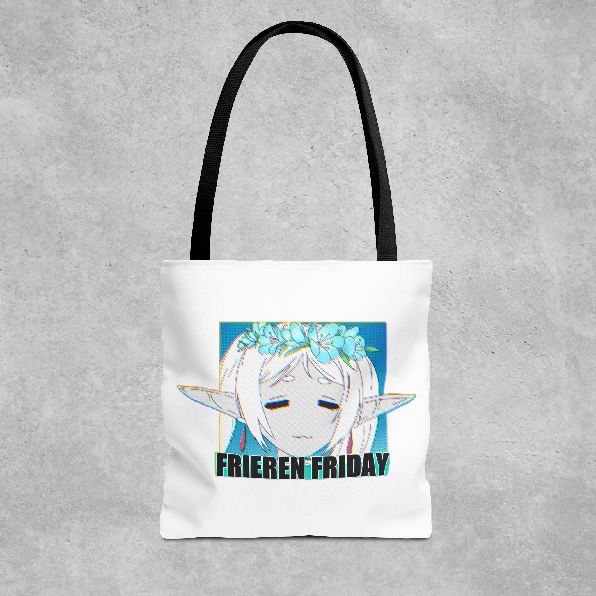 A lightweight, durable tote that carries quiet fandom with gentle style. This polyester tote features a soft white body and contrasting black handles, showcasing a serene anime-inspired portrait framed by cool teal tones and the text “FRIEREN FRIDAY.” It feels like a small, personal nod to slow moments—library runs, class notes, weekend markets—without shouting for attention. The roomy boxed corners and reinforced handle stitching hold sketchbooks, snacks, or a compact laptop with confidence. For someone who likes understated otaku flair and practical design, this tote slips into daily life easily and wears in, not out.